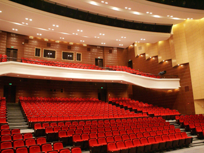 本劇場內(nèi)部平面為長方形,頂棚為梯坡狀,建筑造型大方、漂亮。在原影劇院的基礎(chǔ)上改造而成。觀眾廳有效容積:5600m3,總表面積:2426m2,滿場觀眾數(shù):780人,每座所占有效容積為7.2m3。舞臺有效容積:8470m3,總表面積:2420m2,
